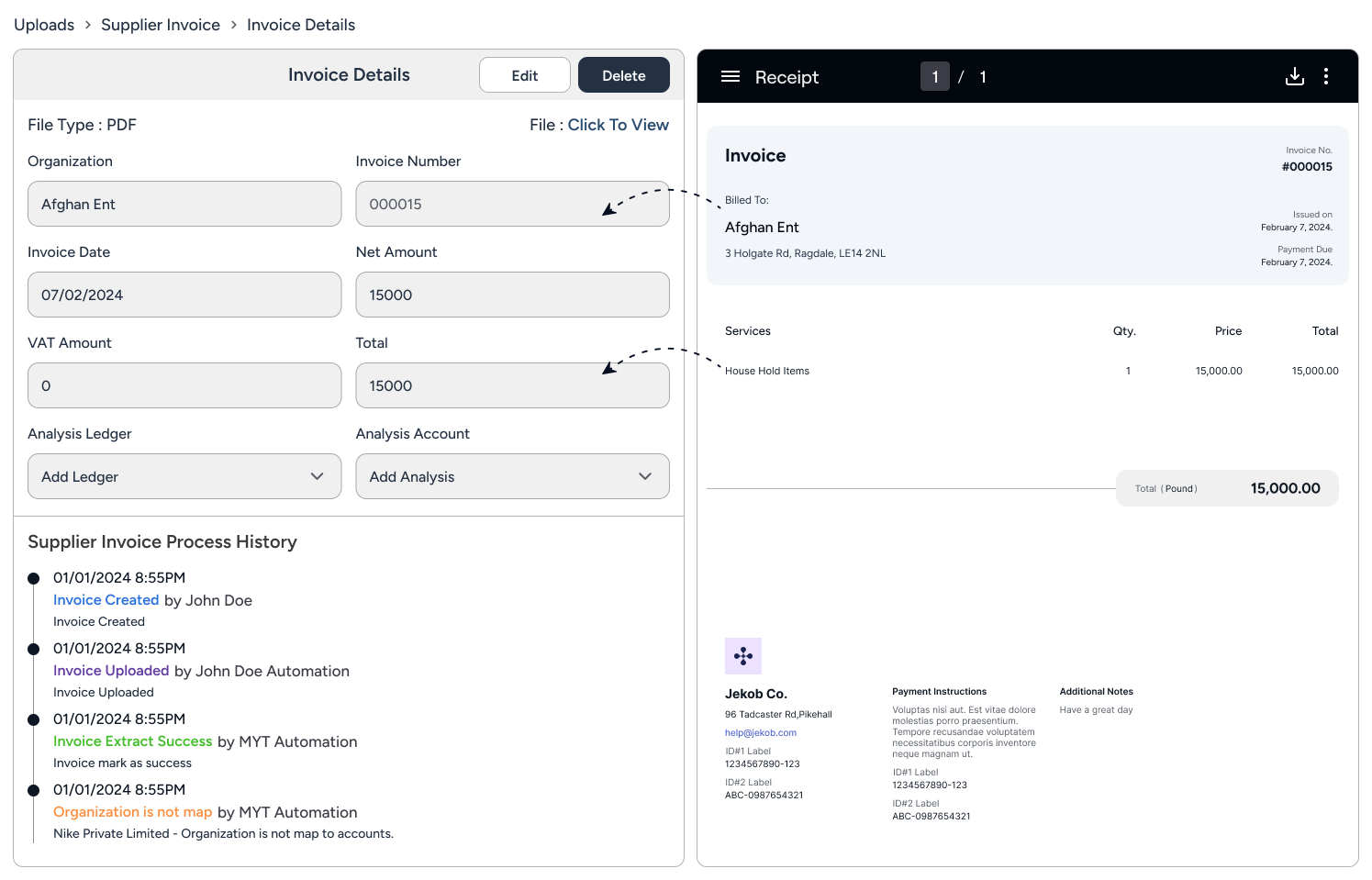 - The suppliers’ names, amounts, invoice numbers and dates are then extracted